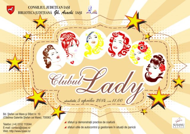 Sâmbătă, 5 aprilie a.c., începând cu ora 11:00, Biblioteca Judeţeană „Gh. Asachi” invită publicul feminin la cea de a doua întâlnire a Clubului Lady. La această întâlnire doamna Elisa Lucescu, stilist şi formator în domeniu, ne propune sfaturi şi demonstraţii practice de coafură. În partea a doua a întâlnirii psiholog Ionuţ Ivanciu, coordonatorul Departamentului de Intervenţii în caz de dezastre (Filiala Iaşi a Societăţii Naţionale de Cruce Roşie) ne va oferi sfaturi utile de autocontrol şi gestionare în situaţii de panică.