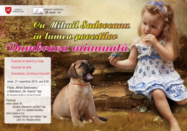 Vineri, 21 noiembrie 2014, ora 9.00, Filiala ,,Mihail Sadoveanu,” organizează activitatea „Cu Mihail Sadoveanu în lumea poveștilor-Dumbrava minunată”. Invitaţi sunt elevii clasei I-a B, de la Şcoala „Alexandru cel Bun” care vor prezenta sceneta în versuri „Dumbrava minunată” coordonaţi de Profesor învăţător primar Isabela Dimitriu și elevii clasei aII-a de la Colegiul Tehnic „Ion Holban”, coordonaţi de Profesor învăţător primar Roxana Sima. Elevii vor prezenta o expoziţie de colaje şi desene din povestea „Dumbrava minunată”.