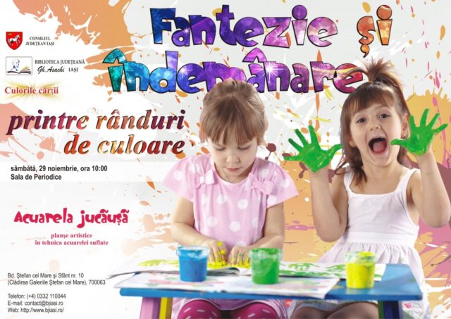 Biblioteca Judeţeană „Gh. Asachi” în parteneriat cu Universitatea de Arte „George Enescu” din Iași vă invită sâmbătă, 29 noiembrie 2014, începând cu ora 10.00, la Sala de Periodice, la atelierul de creație Fantezie și îndemânare printre rânduri de culoare.