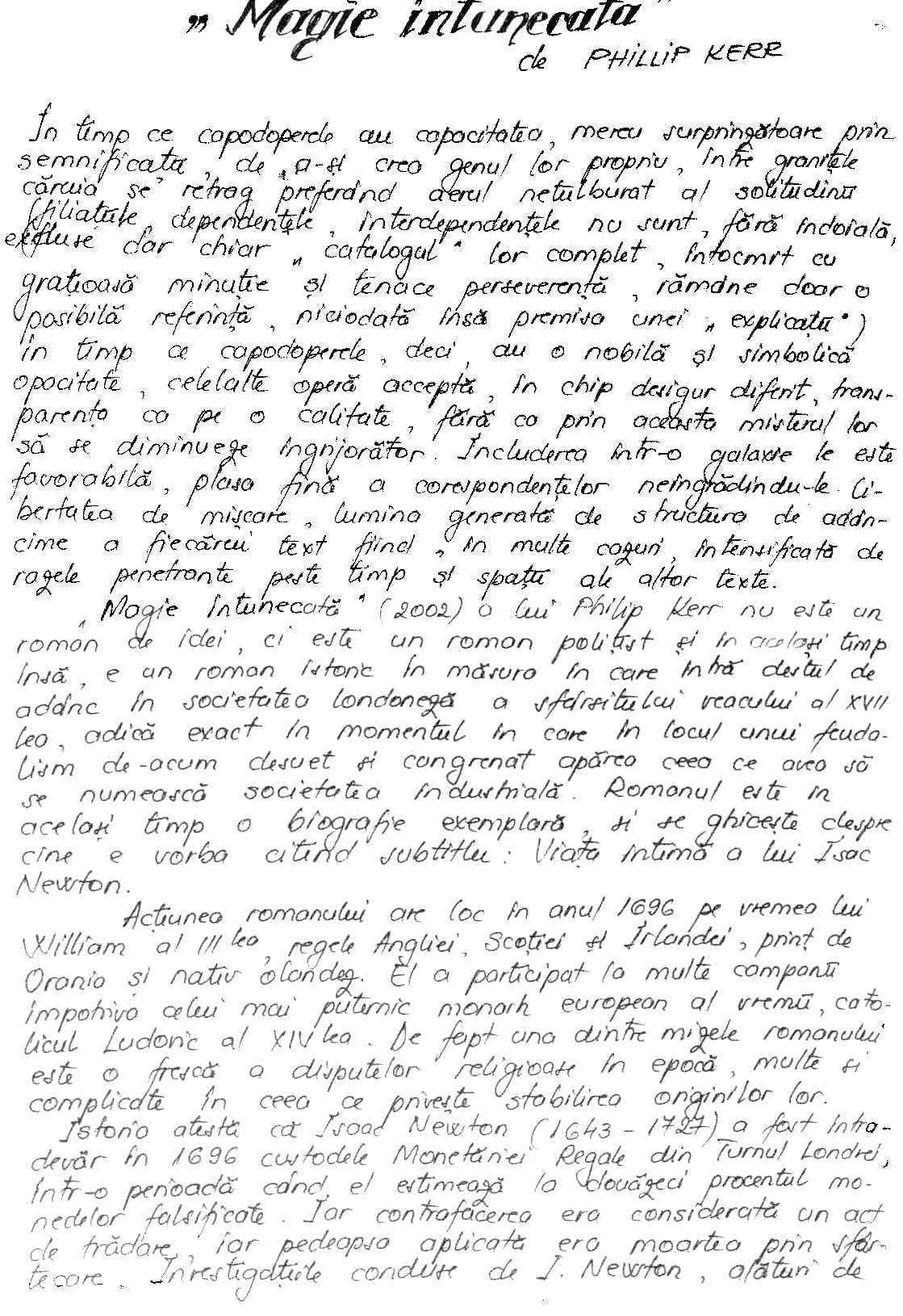 „Magie întunecată” (2002) a lui Phillip Kerr nu este un roman de idei, ci este unul poliţist şi, în acelaşi timp, un roman istoric, în măsura în care intră destul de adânc în societatea londoneză a sfârşitului veacului al XVII-lea, adică exact în momentul în care, în locul unui feudalism, de acum desuet şi cangrenat, apărea ceea ce avea să se numească, societatea industrială. Romanul este, în acelaşi timp, o biografie exemplară, şi se ghiceşte despre cine este vorba citind subtitlul: Viaţa intimă a lui Isaac Newton.