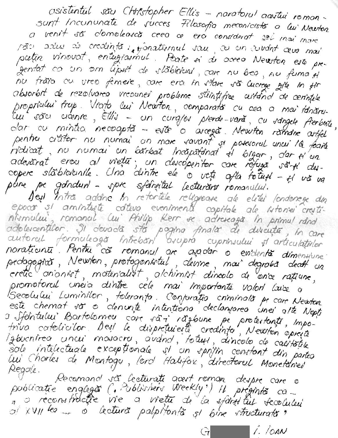 Recomand să lecturaţi acest roman, pe care o publicaţie engleză (Publishers Weekly) îl prezintă ca „o reconstrucţie vie a vieţii de la sfârşitul secolului al XVII-lea… o lectură palpitantă şi bine structurată”.