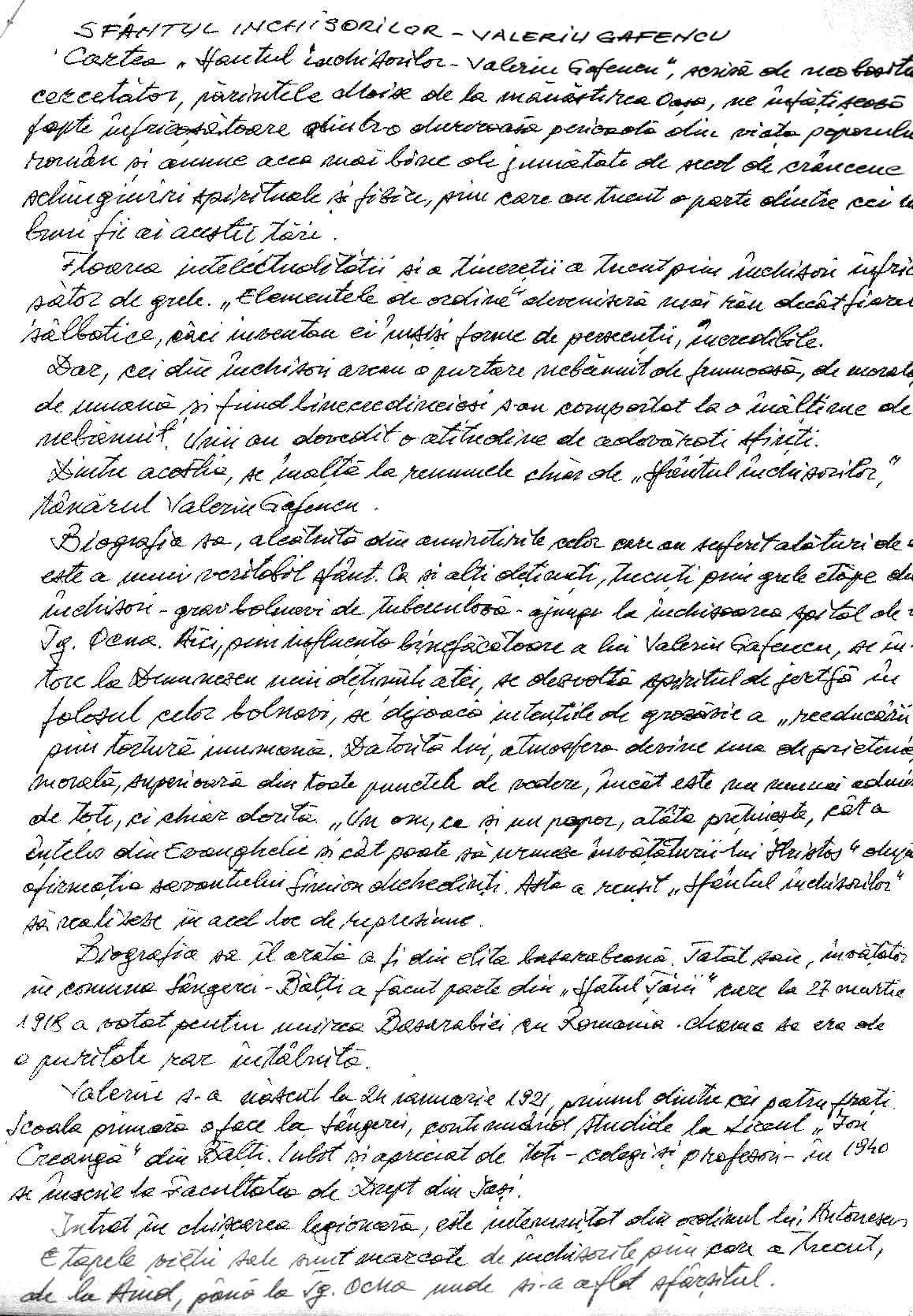 Dintre aceştia, se înalţă la renumele chiar de „Sfântul închisorilor” tânărul Valeriu Gafencu. Biografia sa, alcătuită din amintirile celor care au suferit alături de el, este a unui veritabil sfânt. Ca şi alţi deţinuţi, trecuţi prin grele etape ale închisorii – grav bolnavi de tuberculoză – ajunge la închisoarea-spital de la Tg. Ocna. Aici, prin influenţa binefăcătoare a lui Valeriu Gafencu, se întorc la Dumnezeu unii deţinuţi atei, se dezvoltă spiritul de jertfă în folosul celor bolnavi, se dejoacă intenţiile de grozăvie ale „reeducării” prin tortură inumană. Datorită lui, atmosfera devine una de prietenie morală, superioară din toate punctele de vedere, încât este nu numai admirată de toţi, ci chiar dorită. „Un om, ca şi un popor, atâta preţuieşte, cât a înţeles din Evanghelie ţi cât poate să urmeze învăţăturile lui Hristos”, după afirmaţia savantului Simion Mehedinţi. Asta a reuşit „Sfântul închisorilor” să realizeze în acel loc de represiune.