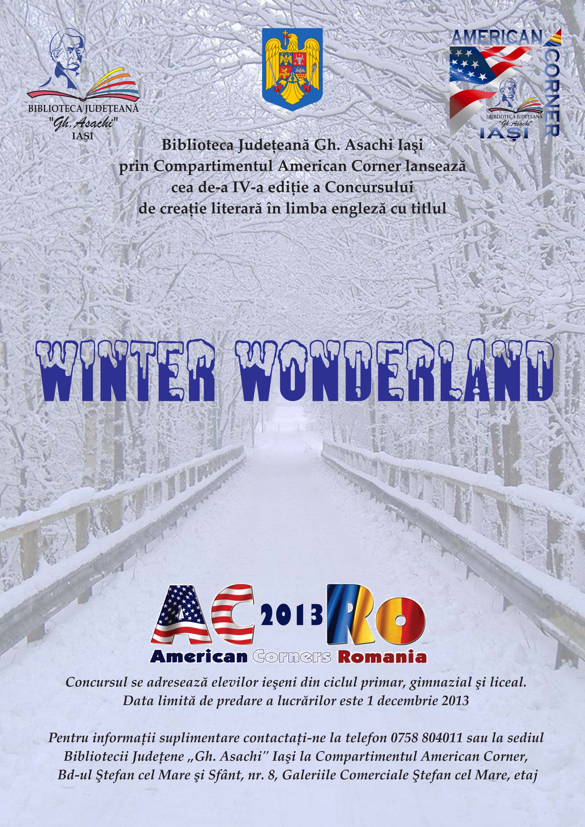 Biblioteca Județeană “Gh. Asachi” Iași, prin Compartimentul American Corner lansează cea de-a IV-a ediţie a Concursului de creaţie literară în limba engleză cu titlul ”Winter Wonderland”.