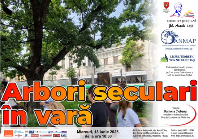 Miercuri, 18 iunie 2025, de la ora 10.30, Biblioteca Județeană „Gh. Asachi” Iași în parteneriat cu Agenția Națională pentru Mediu și Arii Protejate (ANMAP) – Direcția Județeană de Mediu (DJM) Iași și Liceul Teoretic „Ion Neculce” Iași, desfășoară pentru cei mici activitatea: Arbori seculari în vară.
