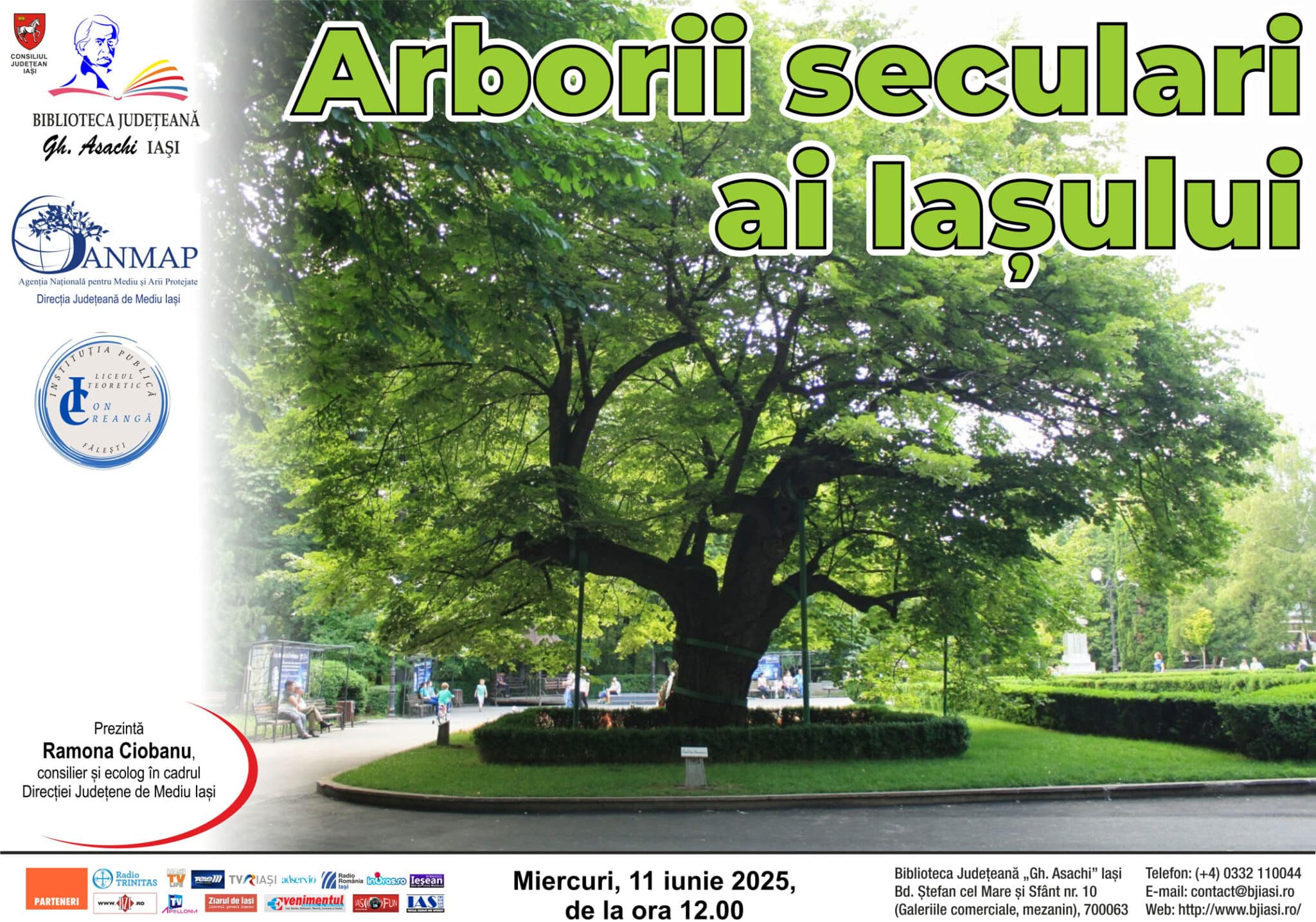 Miercuri, 11 iunie 2025, de la ora 12.00, Biblioteca Judeţeană „Gh. Asachi” Iași în parteneriat cu Agenția Națională pentru Mediu și Arii Protejate (ANMAP) – Direcția Județeană de Mediu (DJM) Iași și Liceul Teoretic „Ion Creangă” Fălești, Republica Moldova, desfășoară activitatea „Arborii seculari ai Iașului”.
