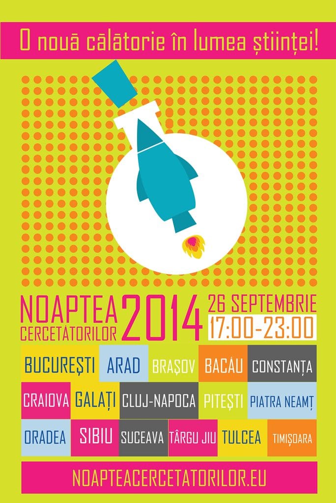Pe 26 septembrie, Noaptea Cercetătorilor îi invită pe toți cei curioși la o călătorie în lumea fascinantă a științei. Cercetători, ingineri, exploratori şi inventatori îți dau întâlnire în campusurile universitare sau zonele centrale ale orașelor: București, Iași, Cluj-Napoca, Timișoara, Constanța, Craiova, Galați, Brașov, Suceava, Bacău, Arad, Sibiu, Piatra Neamț, Tulcea, Oradea și Târgu Jiu. Alături de ei vei lua parte la experimente inedite, conferinţe captivante și concursuri cu premii atrăgătoare. Programul pentru fiecare oraș poate fi consultat pe www.noapteacercetatorilor.eu.
