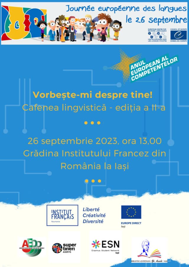”Vorbește-mi despre tine!” marchează Ziua Europeană a Limbilor, la Iași, în 2023 – Anul European al Competențelor. Evenimentul pune în evidență bogăția lingvistică și culturală a Europei și faptul că împreună suntem mai puternici.