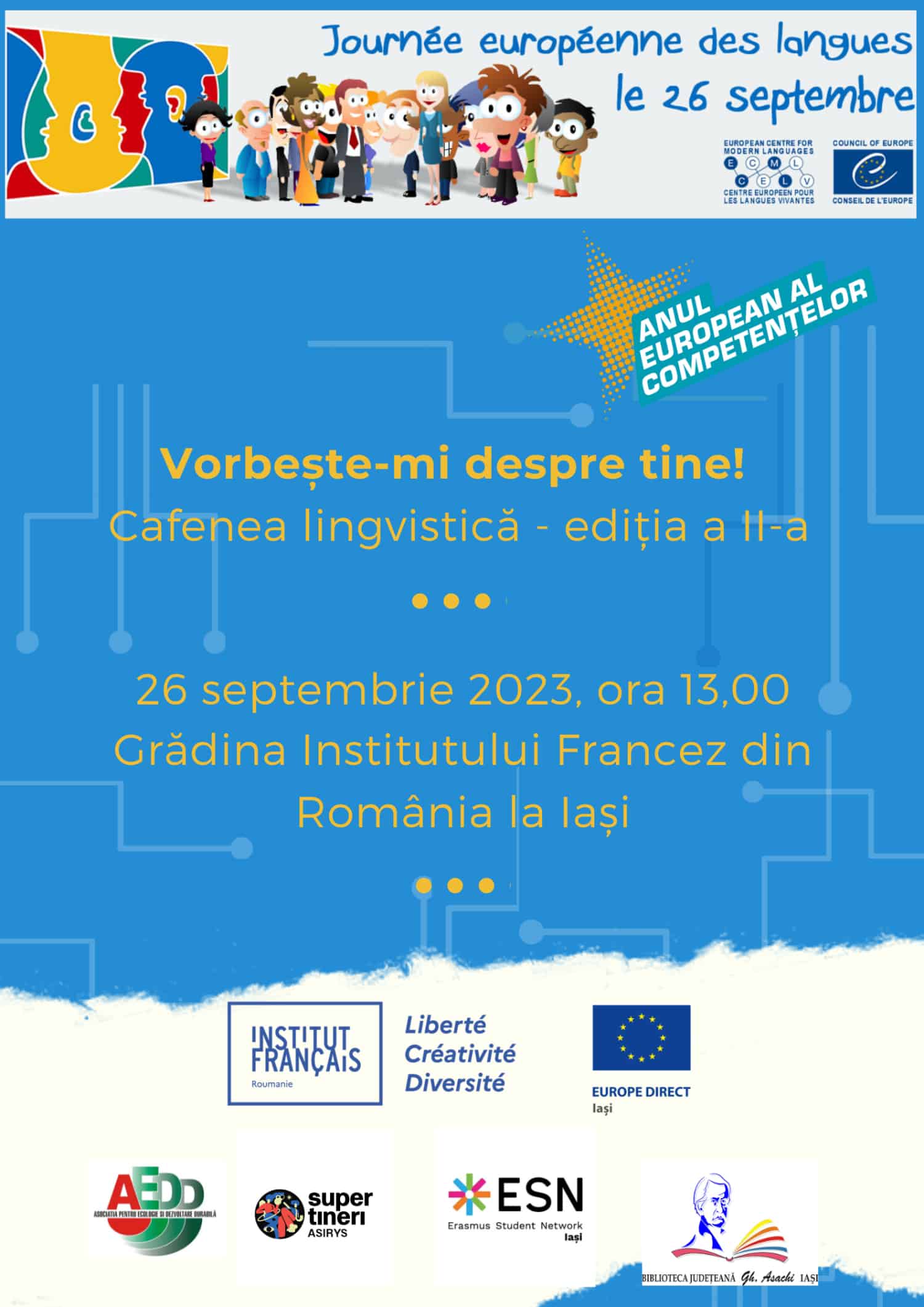 Pe 26 septembrie 2023, de la ora 13,00-14,30, te așteptăm la Institutul Francez din România la Iași, să experimentezi bogăția lingvistică și culturală a Europei.