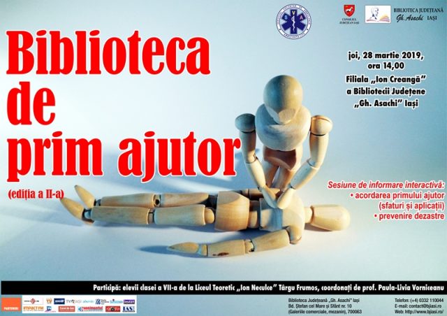 În 28 martie 2019, ora 14.00 la Filiala „Ion Creangă” (Casa de Cultură a Sindicatelor, Bd. Socola nr. 34 ) se va derula o nouă activitate de informare în cadrul proiectului „Biblioteca de Prim Ajutor” (BiblioInfoLife), inițiat de Biblioteca Județeană „Gh. Asachi” Iași în parteneriat cu Serviciul Voluntar de Ambulanță (S.V.A.) Iași – Asociația Ambulanța. Life.