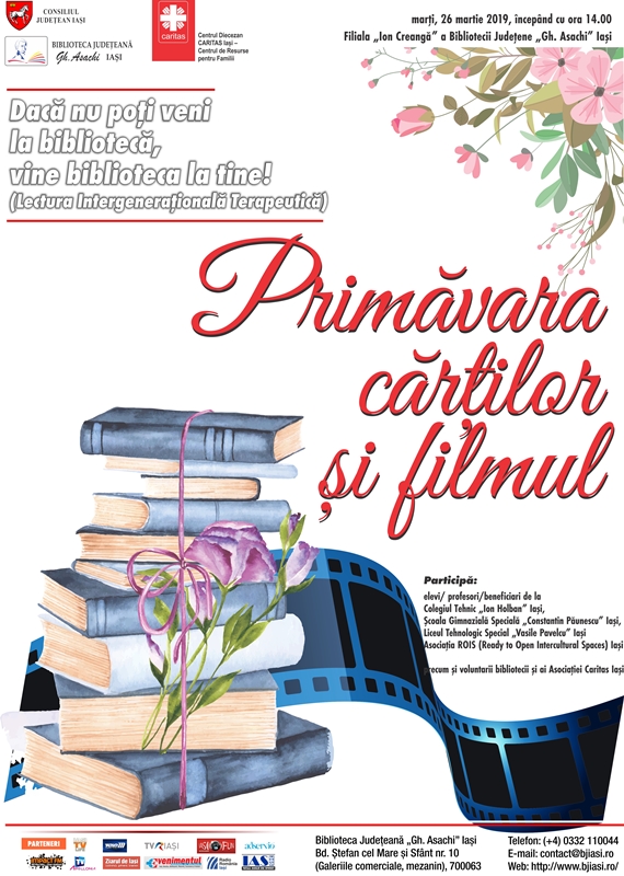 În 26 martie 2019 de la ora 14,00 Biblioteca Județeană „Gh. Asachi” Iași prin Filiala „Ion Creangă” (Casa de Cultură a Sindicatelor, Bd. Socola nr. 34) continuă activitățile specifice din cadrul  proiectului: Dacă nu poți veni la bibliotecă, vine biblioteca la tine! (Lectura Intergenerațională Terapeutică) cu activitatea Primăvara cărților și filmul.