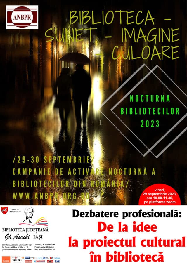 Vă rugăm să participați la Dezbaterea profesională: De la idee la proiectul cultural în bibliotecă, vineri, 29 septembrie 2023, ora 10.00-11.30 pe platforma zoom. Dorim să avem o întâlnire colegială și deschisă, să ne împărtășim activitățile/proiectele/programele culturale ce le desfășurăm în biblioteci și să deschidem noi canale de comunicare în domeniul nostru de activitate. Sunt invitați colegii din bibliotecile publice / școlare /comunale din județul Iași precum și colegii din țară și de peste Prut.