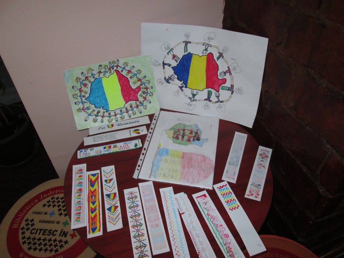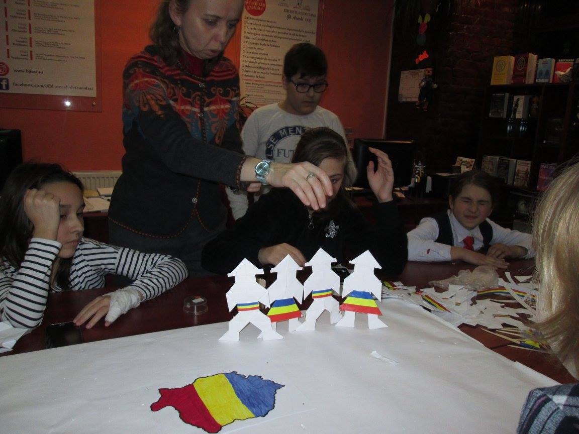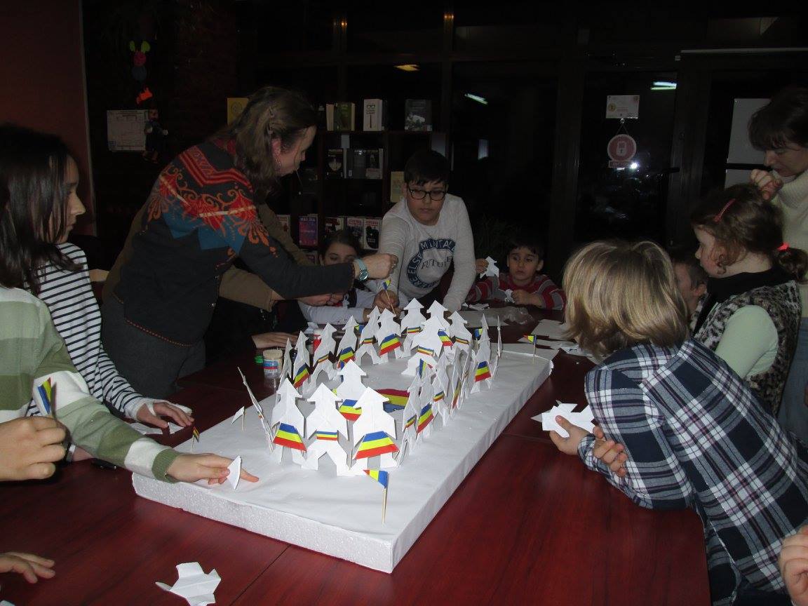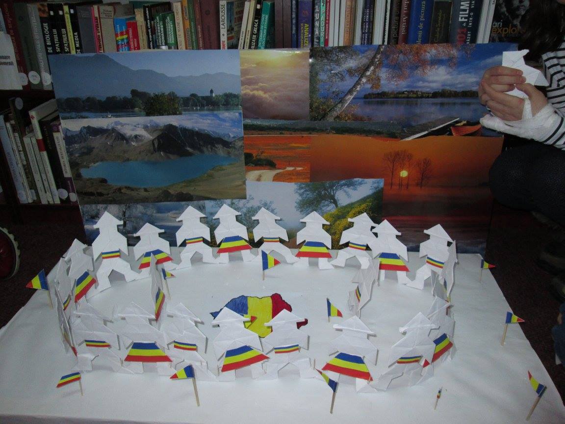 La început elevii au citit povestea „Moș Ion Roată și Unirea” de Ion Creangă iar în urma lucrului din cadrul atelierului de origami a rezultat macheta intitulată „Hai să dăm mână cu mână!”