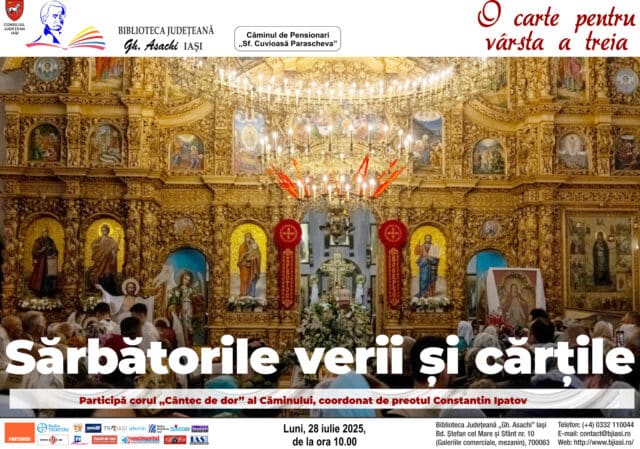 Luni, 28 iulie 2025, de la ora 10.00, Biblioteca Județeană „Gheorghe Asachi” Iași alături de Căminul de Pensionari „Sf. Cuvioasă Parascheva”, desfășoară activitatea Sărbătorile verii și cărțile.