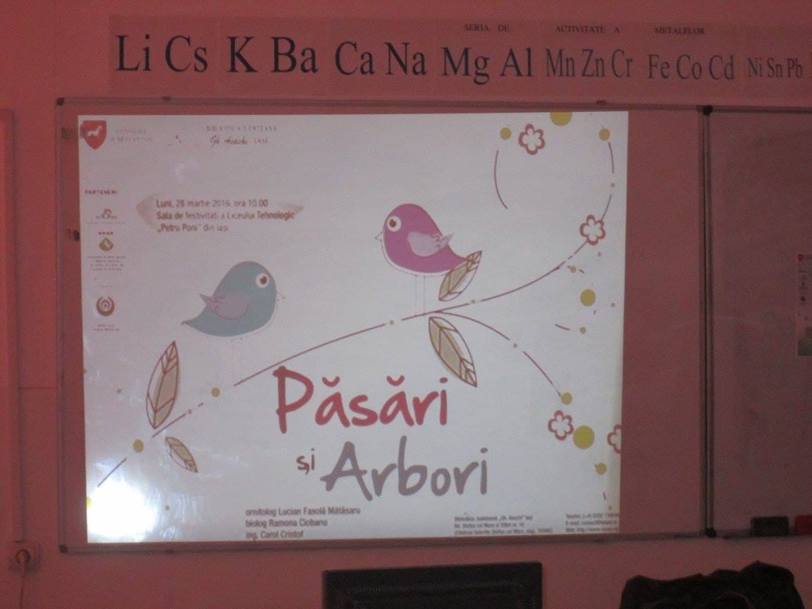 Luni, 28 martie 2016, începând cu ora 10.00, la Liceul Tehnologic „Petru Poni” a avut loc prezentarea „PĂSĂRI și ARBORI”, susținută de ornitolog Lucian Fasolă Mătăsaru de la Societatea Ornitologică Română, alături de biolog Ramona Ciobanu și inginer Carol Cristof de la Agenția de Protecția Mediului Iași.