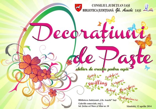 Sâmbătă, 12 aprilie 2014, voluntarele bibliotecii, Cristina Adam şi Ştefania Munteanu, vă aşteaptă la un nou atelier de creaţie pentru copii între 7 şi 11 ani. De data aceasta, tema atelierului este: Decoraţiuni de Paşte. Folosind tehnicile origami şi quilling, hârtie colorată, foarfece, lipici şi, mai ales, multă îndemânare şi răbdare, veţi meşteri, ajutaţi de cele două voluntare, un coşuleţ decorativ care vă va înveseli casa de sărbători.