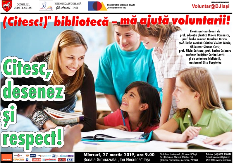 Miercuri, 27 martie 2019, de la ora 09.00, la Școala Gimnazială „Ion Neculce”, Biblioteca Judeţeană „Gh. Asachi” Iași va desfășura o nouă întâlnire din cadrul proiectului „(Citesc!)n bibliotecă – Mă ajută voluntarii” – Citesc, desenez și respect! din proiectul Voluntar@BJIași.
