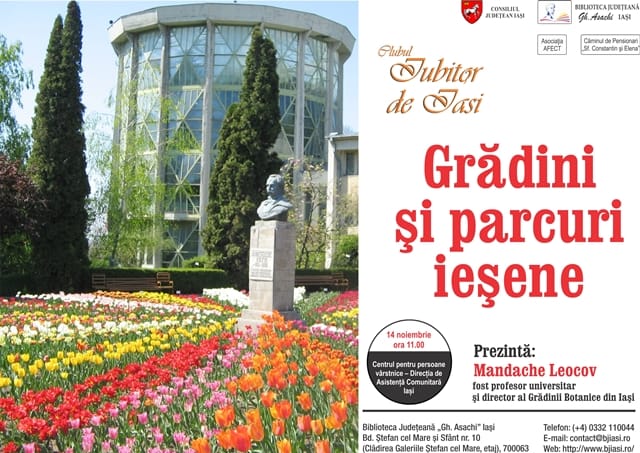 Biblioteca Judeţeană „Gh. Asachi”, Asociația AFECT și Căminul de Pensionari „Sf. Constantin şi Elena” (Bucium) vă invită luni, 14 noiembrie 2016, începând cu ora 11.00, la sediul Centrului pentru persoane vârstnice – Direcția de Asistență Comunitară Iași, la o nouă întâlnire în cadrul Clubului „Iubitor de Iaşi”. Tema – „Grădini și parcuri ieșene” – va fi prezentată de domnul Mandache Leocov, fost profesor universitar și director timp de 17 ani al Grădinii Botanice din Iași.