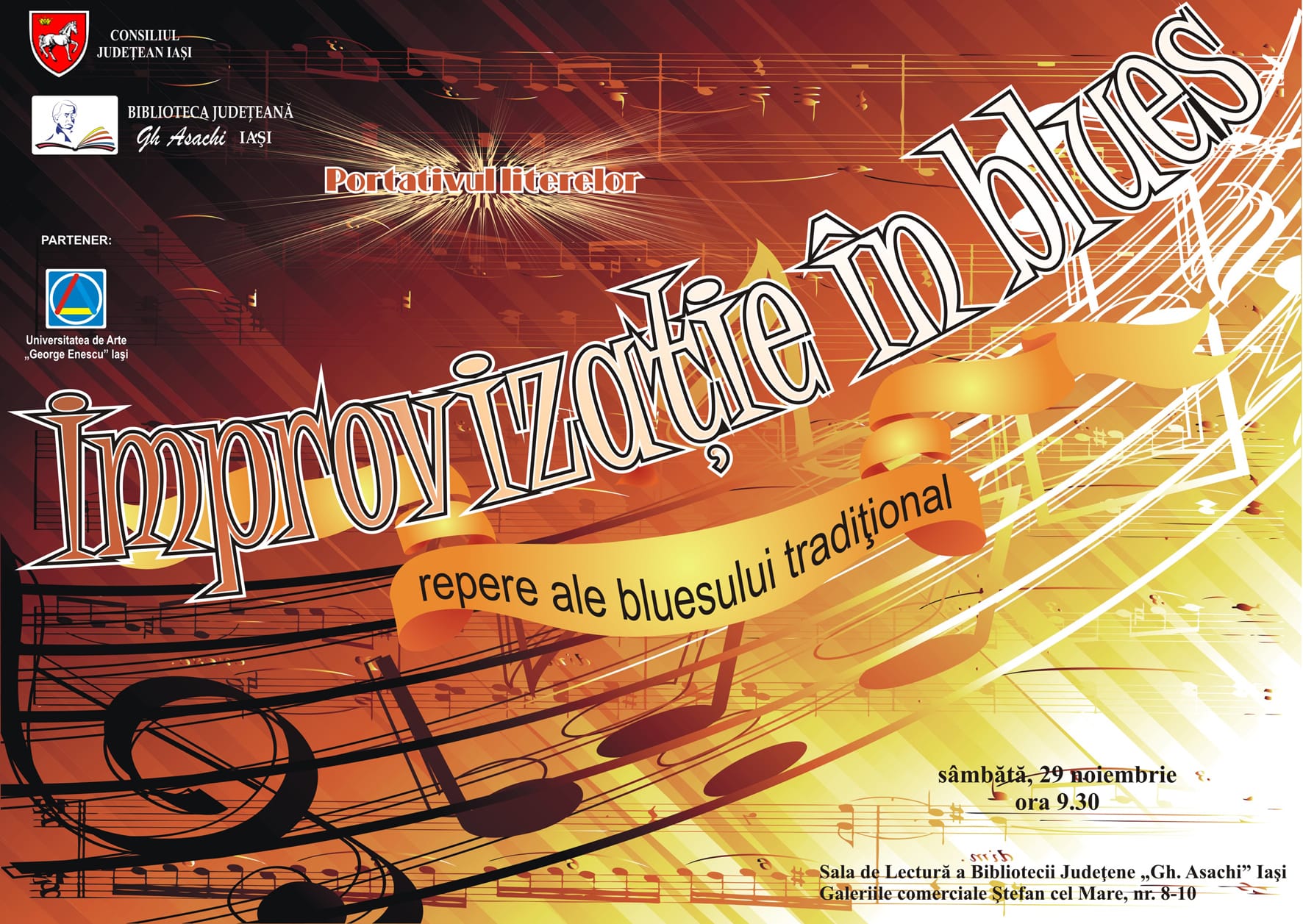 Biblioteca Judeţeană „Gh. Asachi” în parteneriat cu Universitatea de Arte „George Enescu” din Iași invită publicul interesat sâmbătă, 29 noiembrie 2014, începând cu ora 9.30, la Sala de Lectură, la compilația muzicală „Improvizație în blues”.