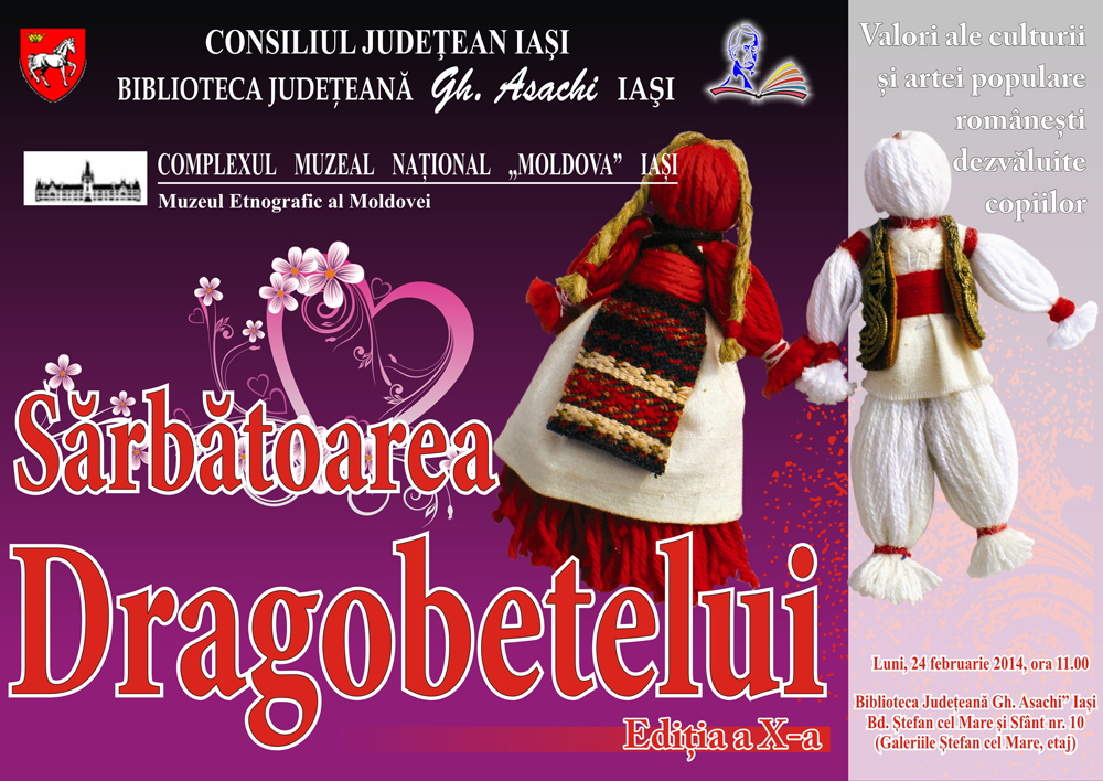 Luni, 24 februarie 2014, ora 11.00, Biblioteca Judeţeană “Gh.Asachi” Iaşi – Biroul împrumut pentru copii, organizează SĂRBĂTOAREA DRAGOBETELUI – ediţia a X-a , în parteneriat cu Complexul Muzeal Naţional “Moldova” Iaşi – Muzeul Etnografic.