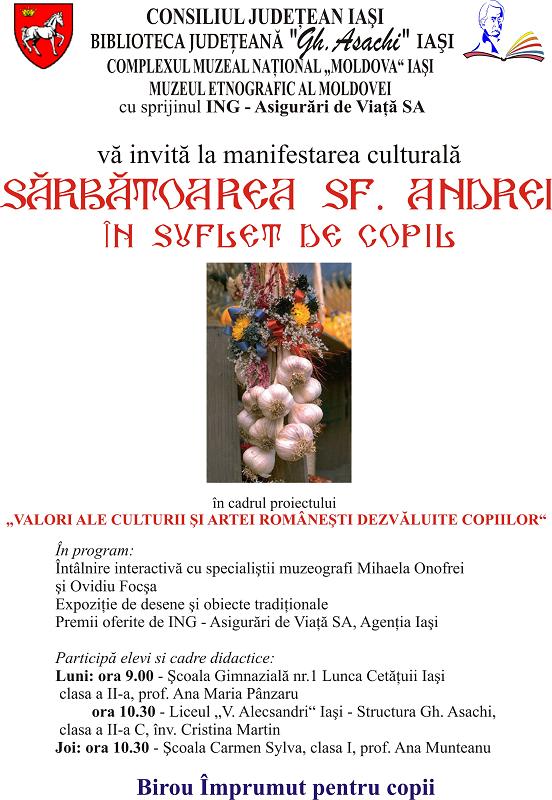 Un prim pas îl reprezintă sărbătoarea Sfântului Andrei, considerat ca fiind ocrotitorul poporului român. Este bine să avem o zi în care să ne amintim sau să cunoaștem tradițiile bunicilor, gândindu-ne la vremea copilăriei, la locurile minunate în care am crescut, să petrecem timp alaturi de famile, de cei dragi. Astfel, în zilele de 25 și 28 noiembrie, la Secția Împrumut pentru copii ne-am întâlnit cu muzeografii Mihaela Onofrei și Ovidiu Focșa, care le-au dezvăluit elevilor de la Școala gimnazială nr.1“Lunca Cetățuii” , Liceul “V Alecsandri” – structura Gh. Asachi și Școala “Carmen Sylva” tainele și simbolurile ce însoțesc sărbatoarea Sfântului Andrei.