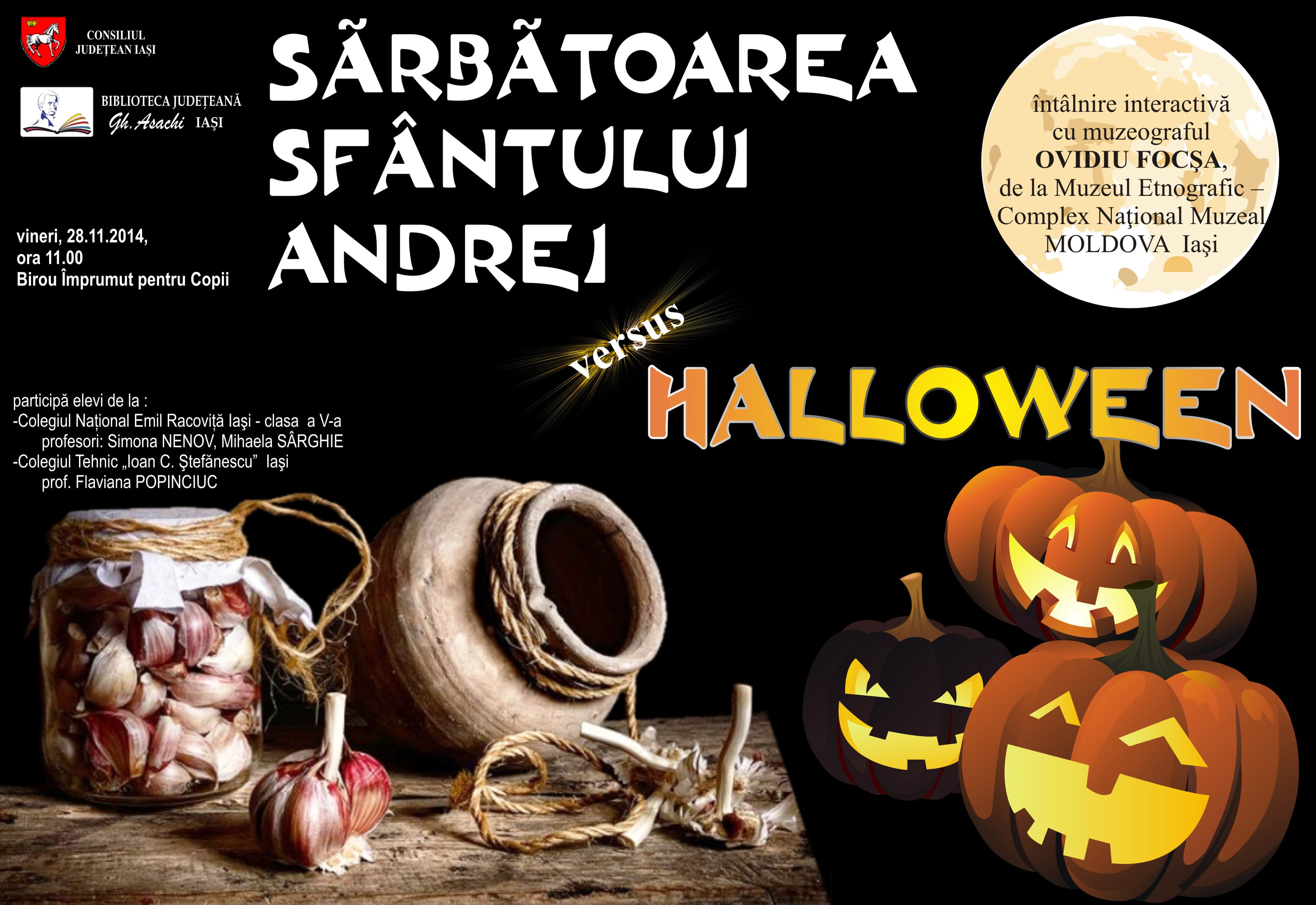 Biblioteca Județeană „Gh. Asachi” Iași organizează vineri, 28 noiembrie 2014, începând cu ora 11.00, la Secția de Împrumut Carte pentru Copii, manifestarea sub genericul „Sărbătoarea Sf. Andrei vs. Halloween”, în cadrul căreia am pregătit o expoziție de lucrări plastice și obiecte tradiționale specifice acestor două sărbători, care deschid cea mai frumoasă perioadă de peste an: Sărbătorile de iarnă. De asemenea, publicul este invitat să participe la o prezentare interactivă susținută de muzeograful Ovidiu Focşa de la Muzeul Etnografic din cadrul Complexului Național Muzeal „Moldova” Iași, care va desluşi celor prezenţi misterul ce învăluie tradiţiile și obiceiurile de Sf. Andrei și Halloween.