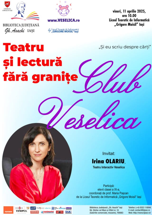 Biblioteca Județeană „Gh. Asachi” Iași în parteneriat cu Teatru Interactiv Veselica coordonat de Irina Olariu va desfășura vineri, 11 aprilie 2025 ora 10.00 un club de lectură sub denumirea: Teatru și Lectură fără Granițe – Club Veselica din cadrul proiectului: „Și eu scriu despre cărți”.