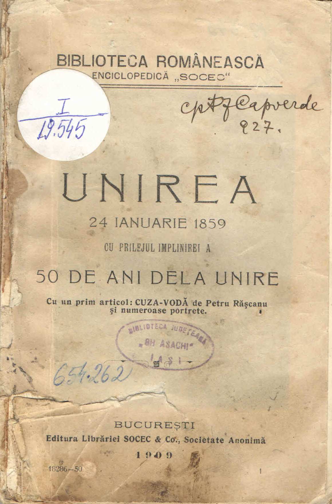 Cu ocazia aniversării Micii Uniri, Biblioteca Județeană Gh. Asachi Iași vă oferă un cadou digital: volumul Unirea. 24 ianuarie 1859, publicat în 1909, la împlinirea a 50 de ani de la eveniment de către Editura Librăriei Socec & Co., Societatea Anonimă.