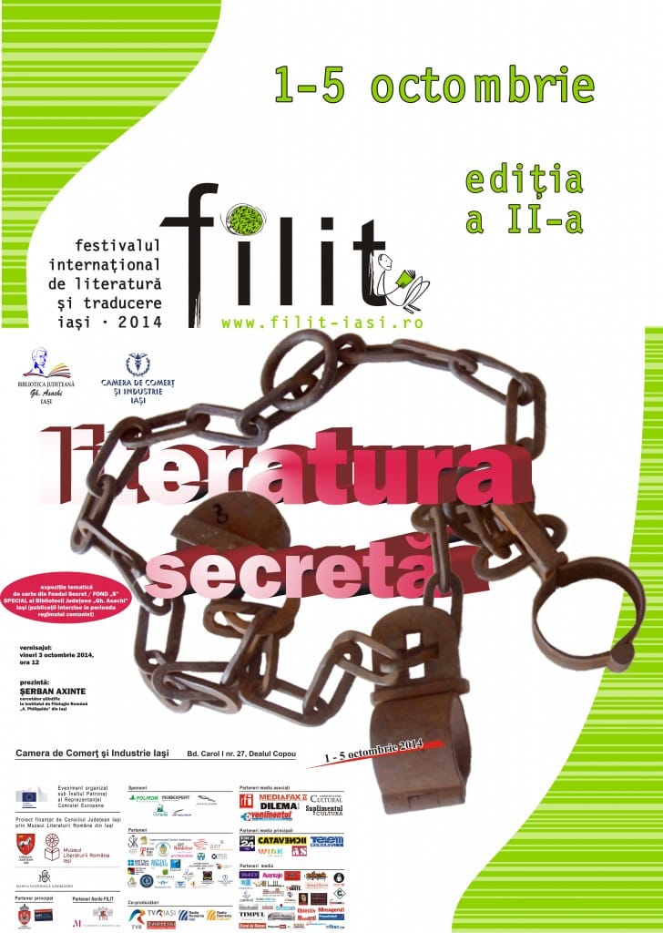 Vineri, 3 octombrie 2014, la Camera de Comerț și Industrie Iași a avut loc vernisajul expoziției tematice de carte ”Literatura secretă”, eveniment inclus în calendarul celei de a II-a ediții a Festivalului Internațional de Literatură și Traducere, 2014. Despre ”decretul cenzurii” și influența pe care acesta l-a avut asupra literaturii a vorbit domnul Șerban Serban Axinte, cercetător științific la Institutul de Filologie Română ”A. Phillipide” Iași al Academiei Române. Cărțile expuse fac parte din Fondul Secret/ Fond ”S” Special de la Biblioteca Judeţeană Iaşi. Expoziția poate fi vizitată până pe data de 5 octombrie, în intervalul 10.00-18.00.